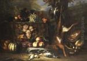 Still Life Of Fruit With A Blue And White Bowl And A Monkey