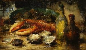 Blomsterstilleben med fruktskal och ostron
