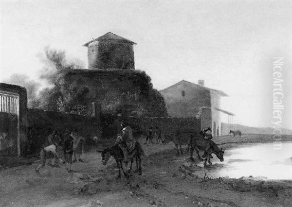 Paysage De La Campagne Romaine Avec Un Troupeau S'abreuvant A Une Mare