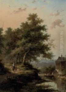 Travelers With A Donkey In A Wooded River Landscape
