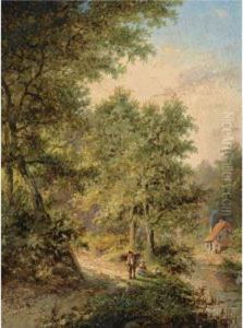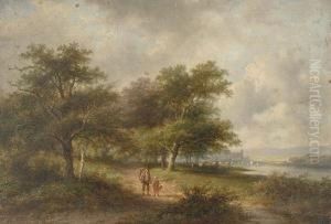 Travellers In A Wooded Summer Landscape, A Village In The Distance