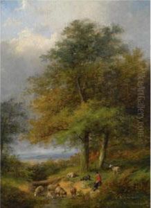 A Shepherd And His Flock In A Wooded Landscape