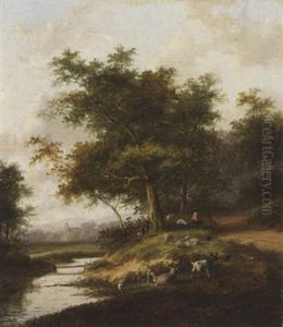 A Wooded Landscape With Peasants Resting On A Sandy Track