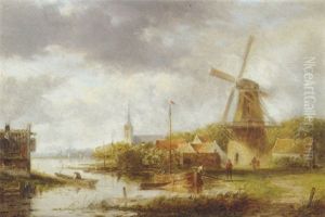 Weite Hollandische Fluslandschaft Mit Windmuhle Und Bauern Vor Einem Gehoft