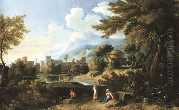 An Roman landscape with peasants resting by a lake with the church of San Andrea Vignola