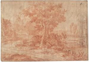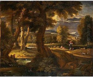 A Classical Wooded Landscape With Bathers, A City Beyond