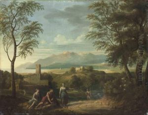 A Classical Coastal Landscape With Figures Resting In Theforeground, Mountains Beyond
