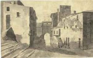 Paesaggio Con Borgo, Rovine E Figure Presso Una Fontana