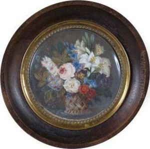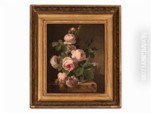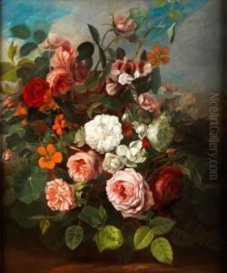Roses, Daisies And Other Blooms In A Wicker Basket, With Grapes And Peaches On A Ledge (2 Works)