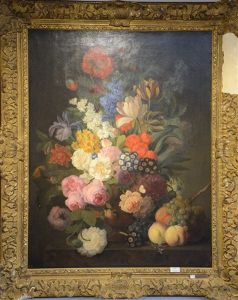Corbeille De Fleurs, Raisins Et Peches Sur Un Entablement De Marbre