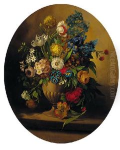 An Iris, Parrot Tulips, Roses, Narcissi And Other Flowers In An Urn (+ Another; Pair)
