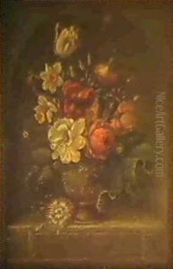 Roses, Lilies, Morning Glory, Clematis And Other Flowers In A Sulpted Urn On A Stone Plinth, In A Casement