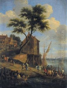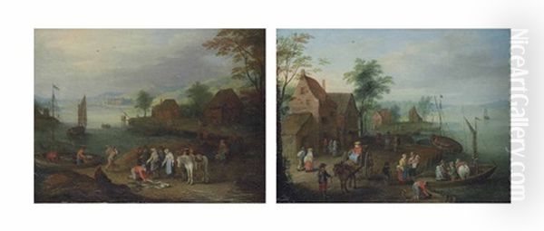A Village With A Horse-drawn Cart And Figures Embarking On A Ferry (+ A River Landscape With Fishermen Selling Their Catch Near A Village; Pair)