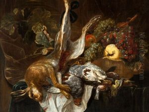 Gibier A Poil Et A Plumes Avec Une Corbeille De Fruits Sur Un Entablement