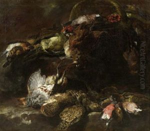 A Mallard, A Bullfinch, Partridges And Other Birds In A Wicker Basket, With A Spaniel And A Cat Fighting