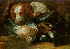 A Hunting Still Life With A Dead Stag And Gamebirds, With A Spaniel On Guard