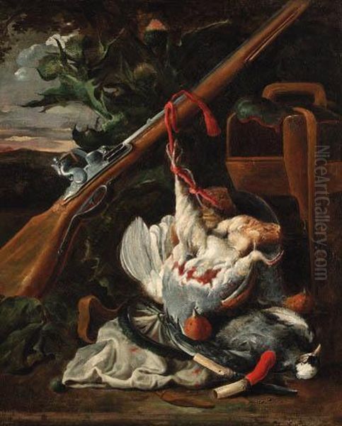 Dead Partridges By A Shotgun In A Landscape