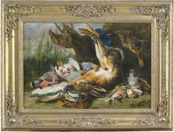Jagdstilleben Mit Erlegtem Hasen, Wildvogeln Und Einer Katze