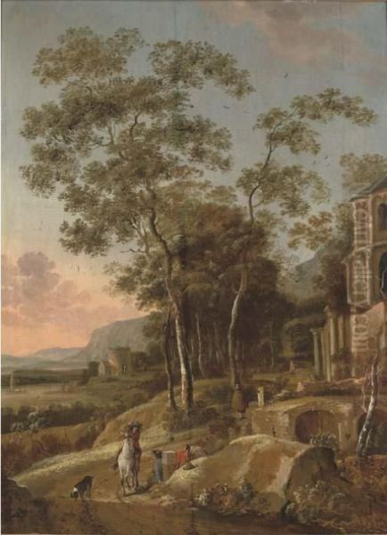 A Wooded River Landscape With A Figure On Horseback And Anglers Resting On A Track