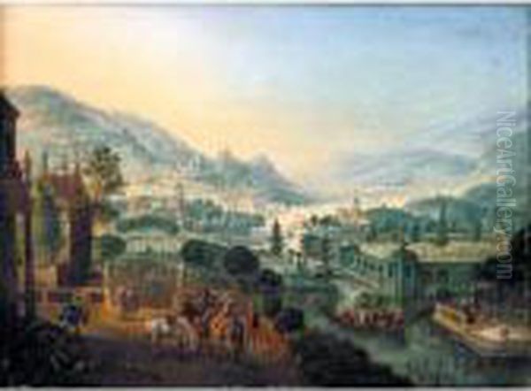 A Capriccio River Landscape With Elegant Figures On A Terrace Overlooking Pleasure Gardens