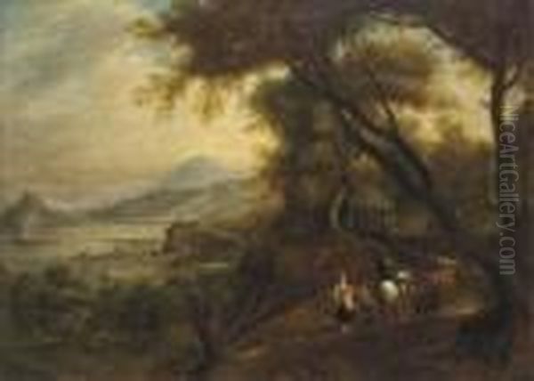 A Rhenish Landscape With Mounted Figures On A Wooded Track