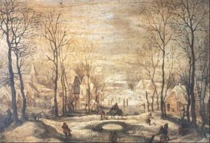 A Winter Landscape With Skaters On A Frozen Waterway By A Village, Antwerp Beyond