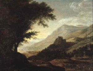 Travellers With Cattle And A Camel On A Bridge By A Ruined Citadel