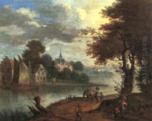 Rhenish Landscape With Figures Unloading Boats, Others Conversing On The Shore, A Castle Beyond