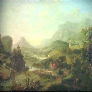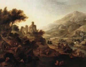 A Mountain Landscape With Figures And Farm Animals Near A River