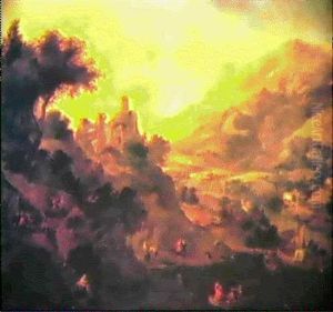 A Rhenish Landscape With Travellers On A Track By A Waterfall