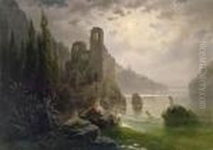 Ideale Landschaft Im Abendlicht Mit Burgruinen U. Figurenstaffage