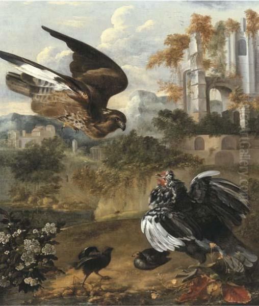 A Hen Protecting Her Chickens From A Hawk, By A Ruin