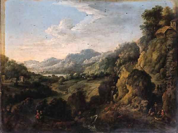 A Rhenish landscape with travellers on a track by a waterfall