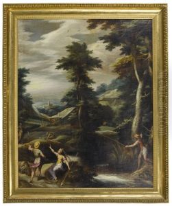 An Extensive Italianate Landscape With Jacob Wresting With The Angel