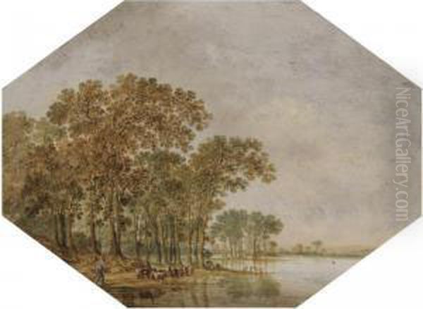 A Wooded River Landscape With A Shepherd Driving His Flock On Thebanks