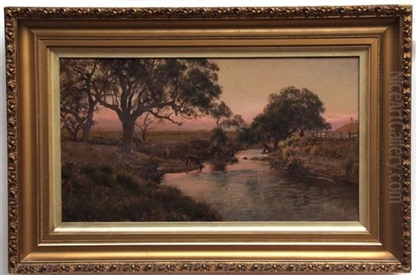 Australian River Landscape With Cattle Watering Oil Painting by Jan Hendrik Scheltema