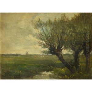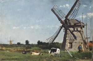 Cows In A Dutch Landscape, A Wind Mill Beyond