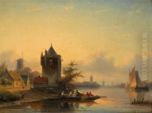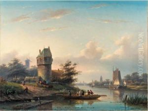 A Summer Landscape With Villagers Along A Canal At Dusk
