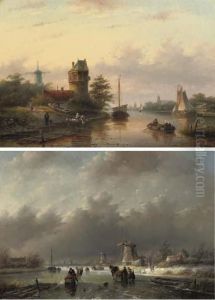 A River Landscape With A Windmill; Skaters On A Frozen River (a Pair)