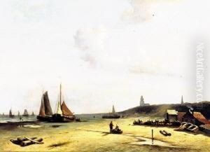 Kustenlandschaft Mit Mehreren Fischerbooten. Am Ufer Geschaftiges Treiben. Unten Links Signiert J. F. Spohler