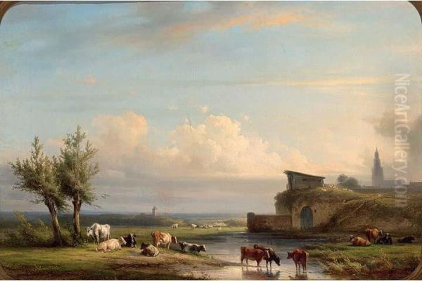 Cattle Watering In An Extensive River Landscape