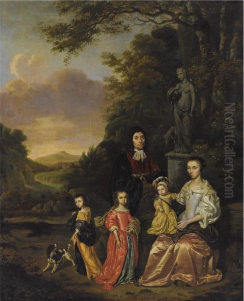 A Portrait Of A Gentleman And His Wife And Their Three Children,possibly The Loth Family, Near A Statue Of Diana The Huntress, In Aclassical Landscape