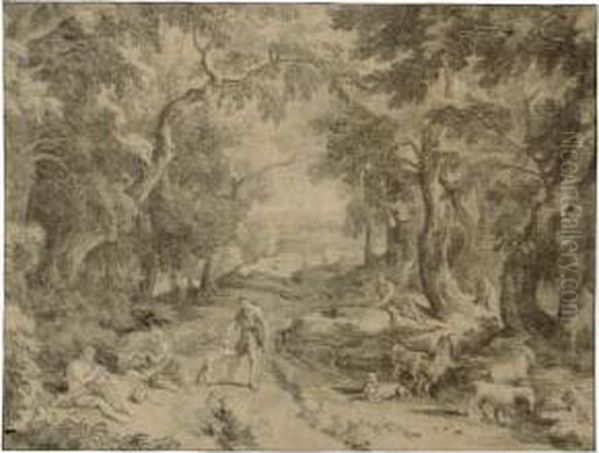 Four Peasants Resting On A Woodland Path, With Their Herd Of Goats To The Right