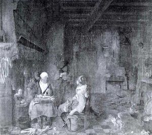 An Old Woman Knitting With A Young Man Smoking A Pipe In An Interior