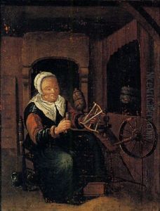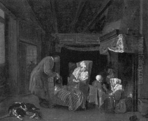 An Old Woman Knitting With A Young Man Smoking A Pipe In An Interior