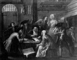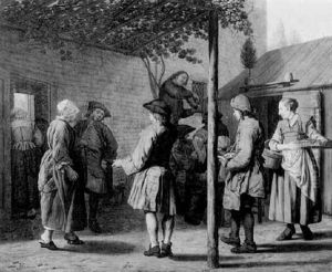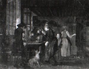Peasant Woman Selling Goods To Villagers Gathered In A Tavern Interior