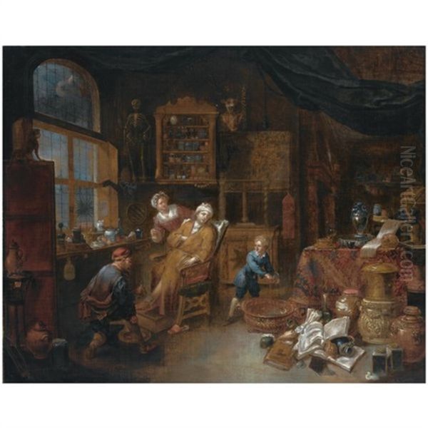 A Doctor's Interior With A Doctor Treating A Patient's Ankle, Together With A Woman Offering A Drink And A Little Boy Nearby, A Still Life Of Books, Jugs, Pots And A Skull To The Right Foreground