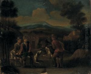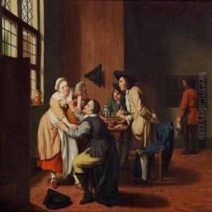 An Interior With Two Men At A Table Attended To By A Maidservant