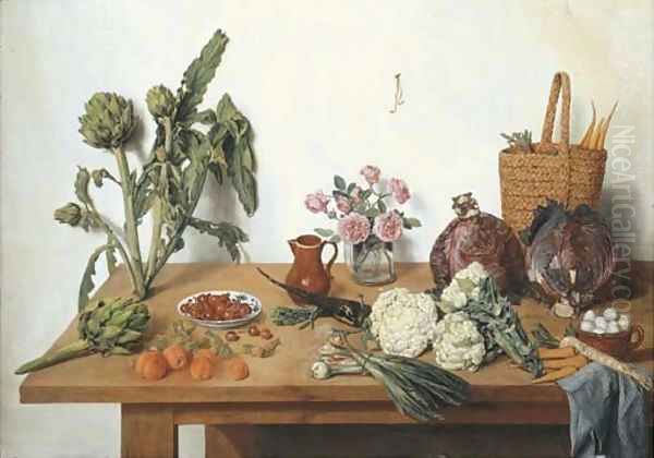 Bring the timeless beauty of Jan Jozef, the Younger Horemans's Cauliflower, onions, peaches, cherries, artichokes, roses in a glass vase, a jug, a basket with carrots, cabbages and eggs with a blue cloth into your home with a handmade oil painting reproduction. Carefully recreated on canvas by skilled artists using traditional techniques, this piece captures the delicate brushwork, subtle light, and vibrant color of the original masterpiece. With museum-level quality and rich texture, it brings elegance and artistic depth to any space. Enjoy free shipping and make this masterpiece a part of your personal collection.
