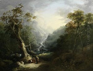 A wooded landscape with travellers on a path by a waterfall